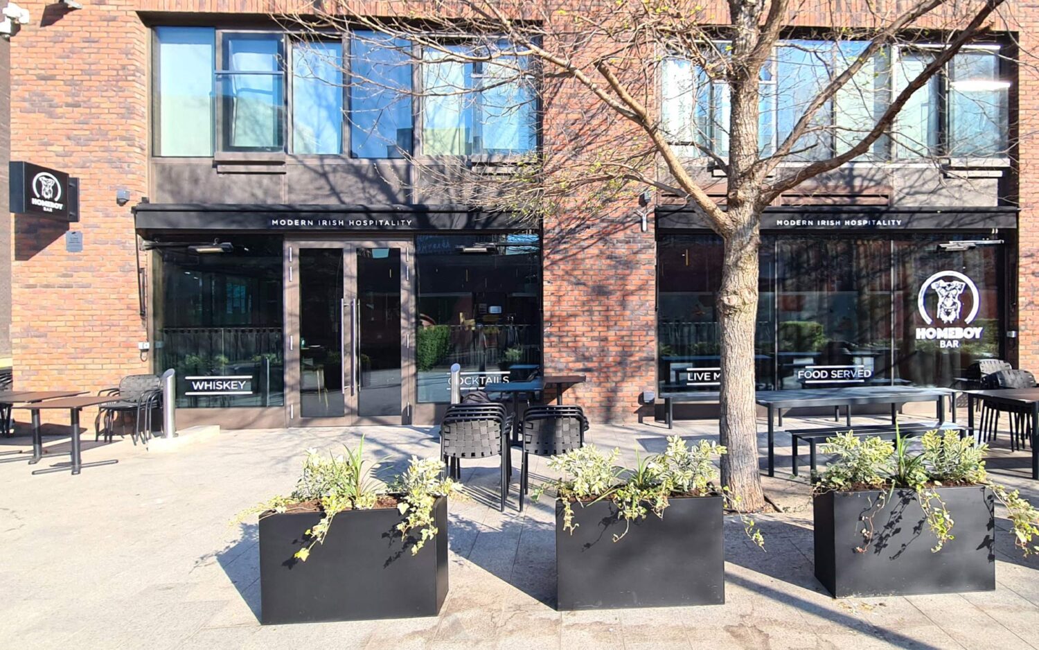 The clean lines of the Embassy Buildings location for the Homeboy Irish Bar in Battersea is reflected in the choice of Greenwich® commercial awnings we have skilfully recessed within the building façade.