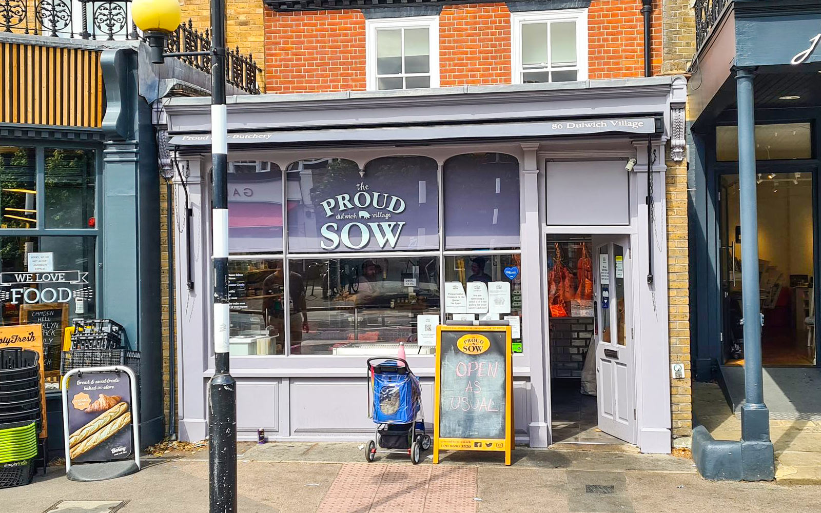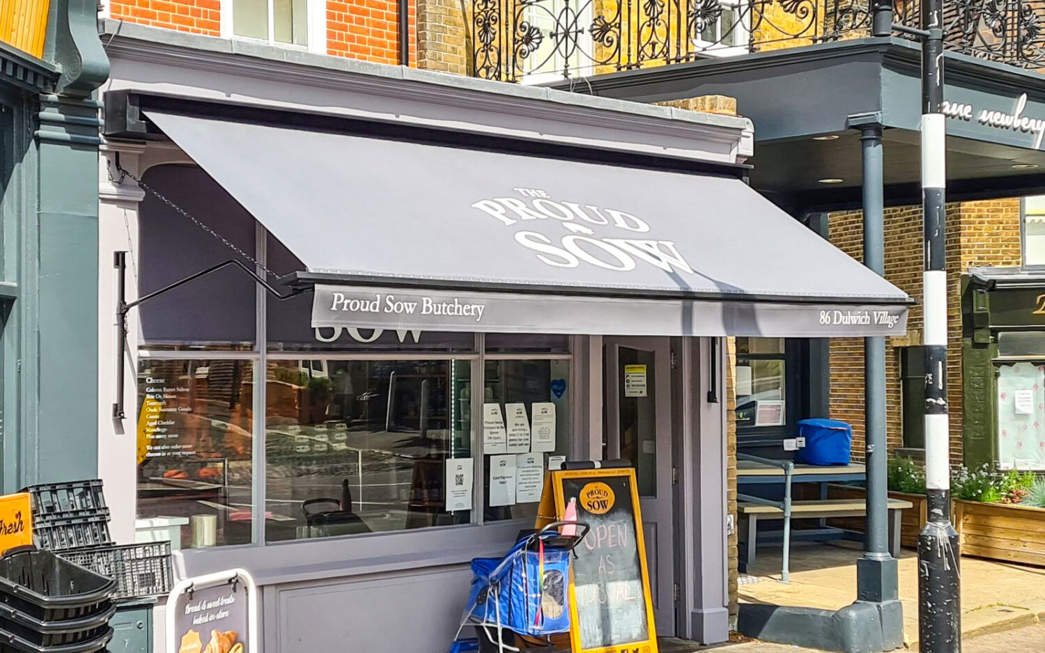 The Proud Sow Butcher in Dulwich Village could not possibly be without a traditional “Butchers Blind” – we call them Victorian awnings today due to their historical heritage – but this sort of awning has been seen, often with red and white stripes, on butchers for years.