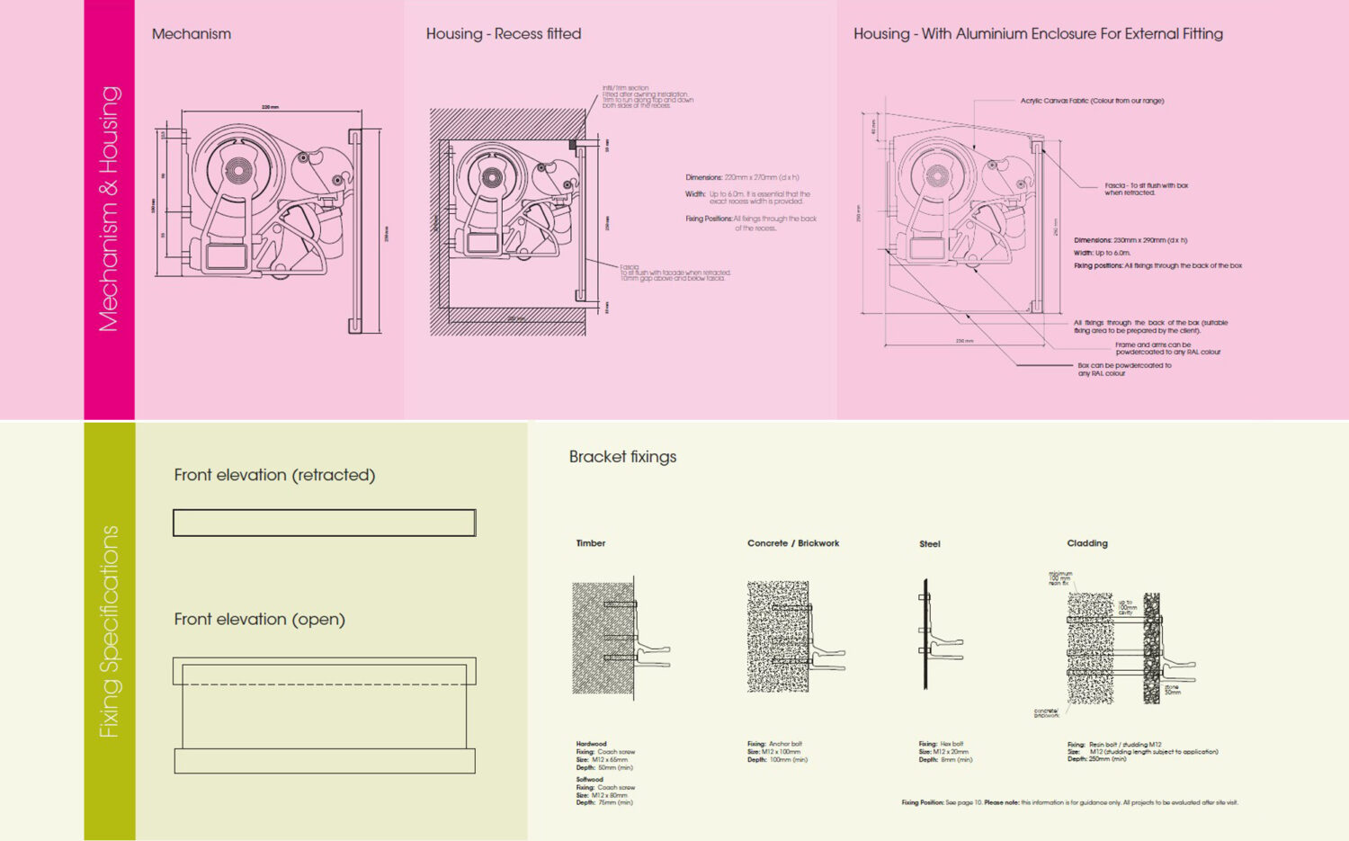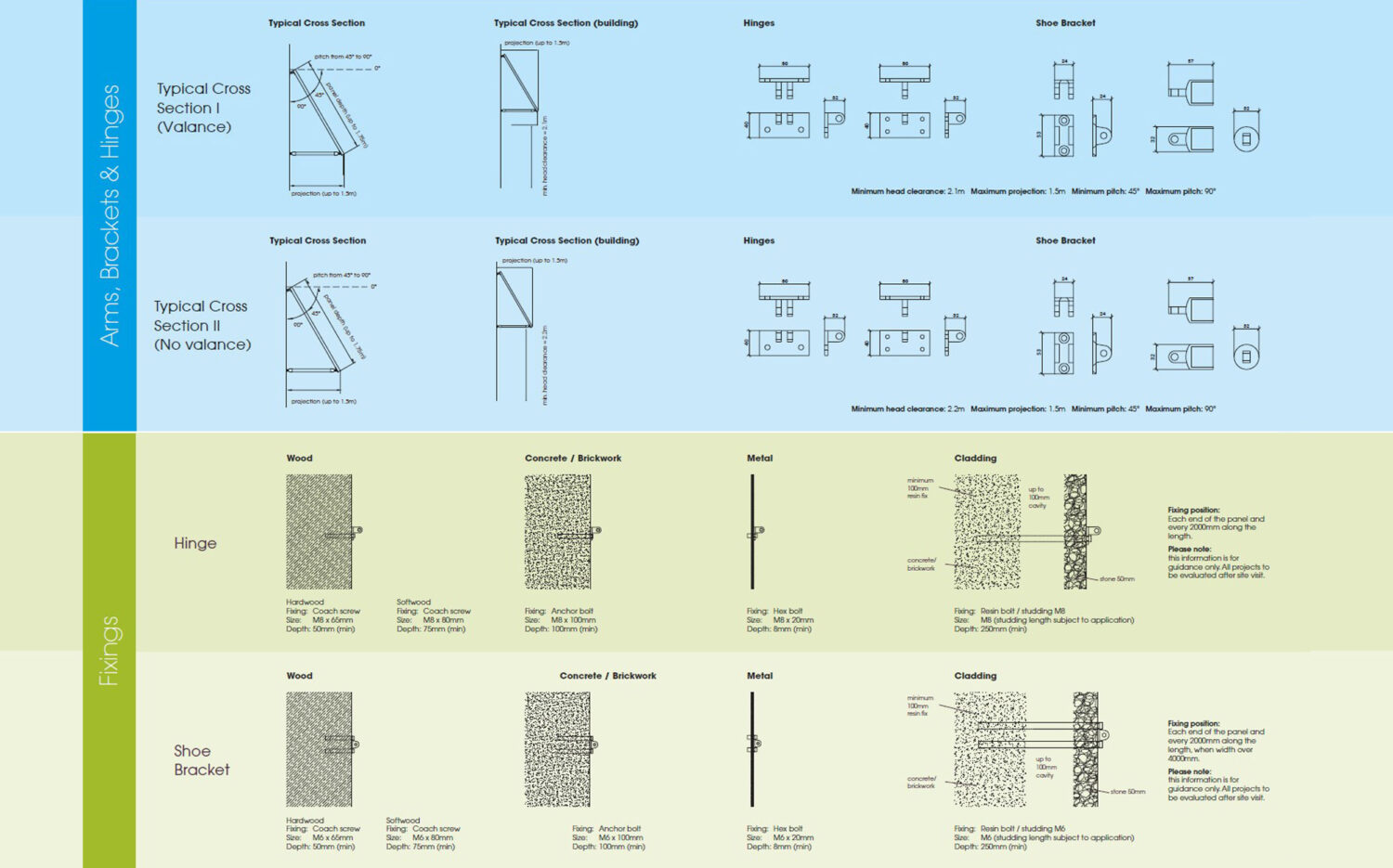Each of the products shown on The Commercial Awning Company website is accompanied by technical drawing to assist in your understanding of the particular product features. You can also contact us for more specific technical information you might need for your particular project.